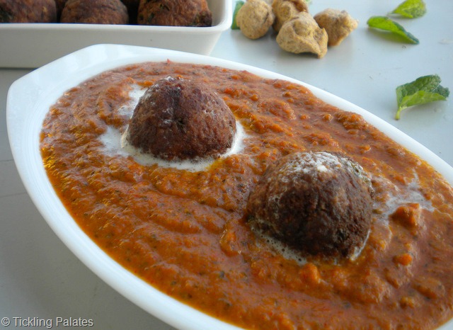 During the recent visit of my MIL, she wanted to know how to use these chunks as she has never cooked them before and since I started cooking them only recently she had no way of seeing these in my kitchen earlier. I made a low cal version of the koftas by cooking them in the paniyaram pan. But you can also deep fry these balls in oil and they will make a very good snack for the kids. Also when made this way, even people who hesitate to eat soya because of its distinct smell will not think twice at all about consuming them as the flavor of the gravy will mask the soya smell even though there won’t be any actually.